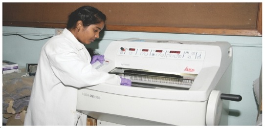 The histopathology lab prepares tissue sections to facilitate the microscopic examination for establishing a histopathologic diagnosis. The specimens submitted to histopath lab include biopsies or whole tissue organs. The role of this histopath lab involves in Tissue processing, paraffin block preparation, sectioning and staining procedures. It also provides cryotraining to the users.